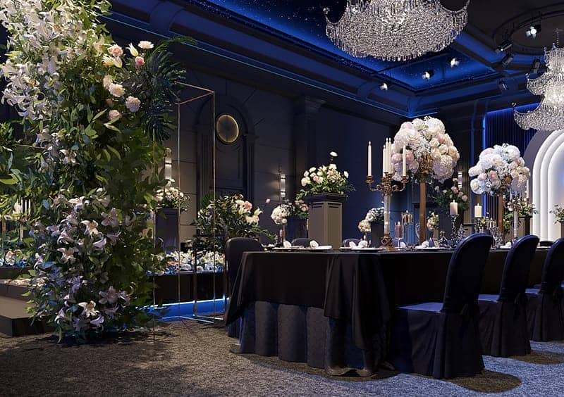 會(huì)場(chǎng)大廳的裝修設(shè)計(jì)會(huì)帶給賓客強(qiáng)烈的氛圍感受,過(guò)高的天頂適合那些人數(shù)較多,場(chǎng)面較大的婚禮。較低的天頂只適合那些人數(shù)較少、溫馨的小型婚禮。
