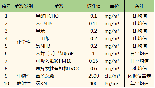 內(nèi)容介紹: 2010年國家頒布的室內(nèi)空氣質(zhì)量檢測標(biāo)準(zhǔn)全部參數(shù)為(見下圖)