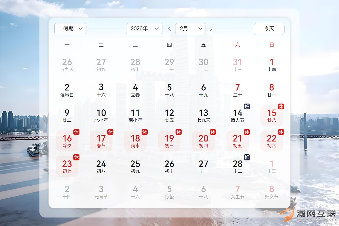 2月15日(農歷臘月二十八、周日)至23日(農歷正月初七、周一)放假調休,共9天。2月14日(周六)、2月28日(周六)上班。